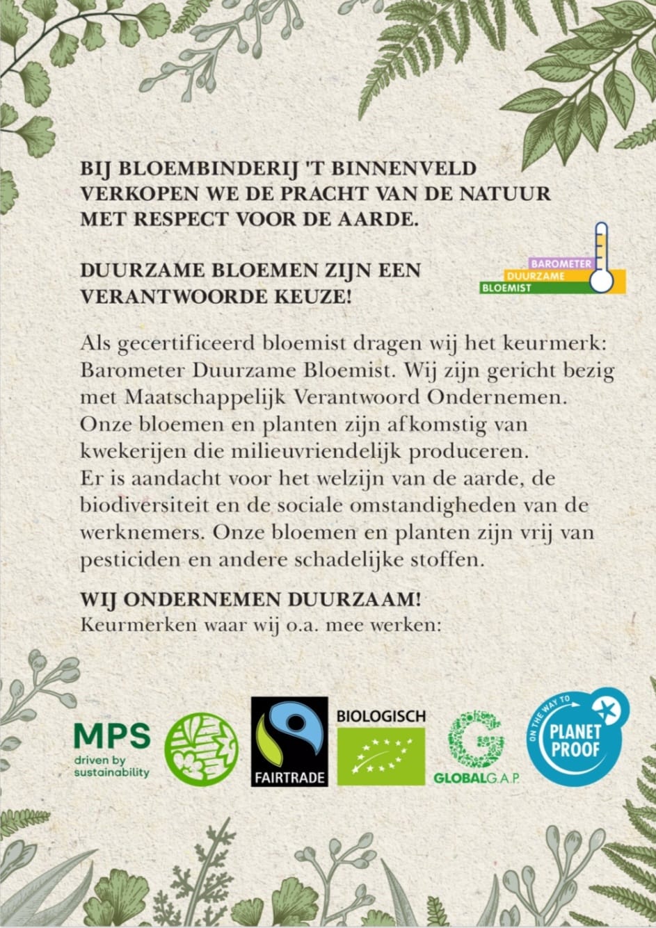 Bij Bloembinderij 't Binnenveld verkopen we de pracht van de natuur met respect voor de aarde.