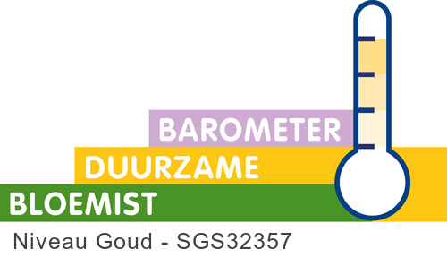 Sinds 2020 dragen wij het keurmerk Barometer Duurzame Bloemist – een onafhankelijk keurmerk voor bloemisten die aantoonbaar duurzaam en maatschappelijk verantwoord ondernemen. Deze certificering kent drie niveaus: brons, zilver en goud. Voor het hoogste niveau, goud, moet minimaal 50% van de bloemen en planten aantoonbaar duurzaam zijn ingekocht.